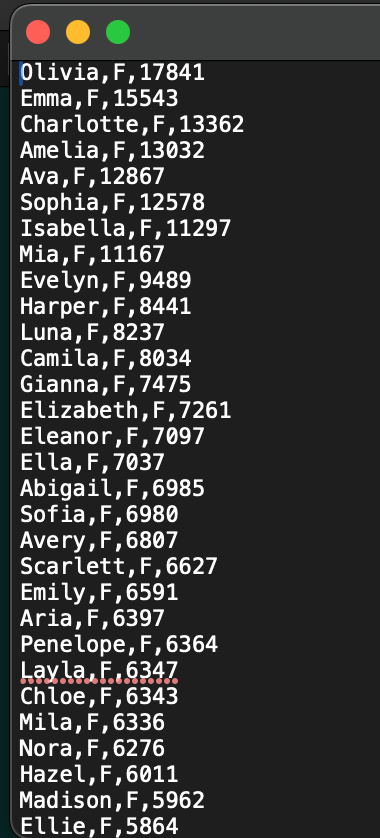 But we’re interested in the total occurrence of baby names for each year (starting from 1880) which you download as a collection of individual text files. With this wealth of information, it’s no wonder that there are a lot of interesting analyses floating online (see: How to Tell Someone’s Age When All You Know Is Her Name and Predicting names from ages). Here’s an example of what the data looks like for 2024, where the first column is the name, the sex (female/male), and the number of occurrences: