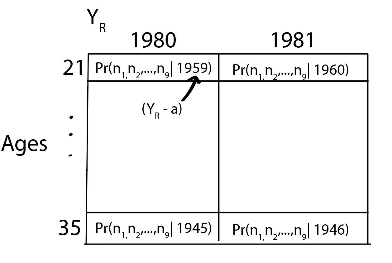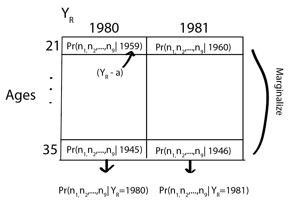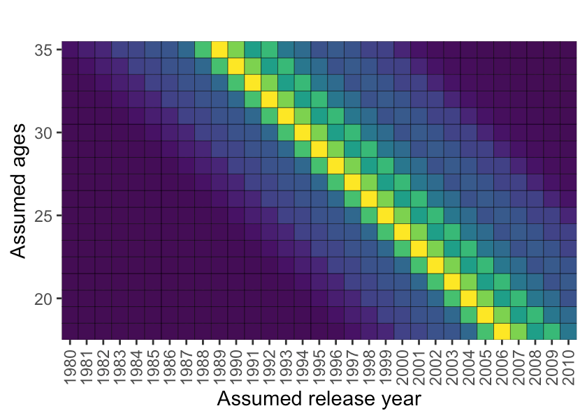 For example, if we guess the release year is 1980 and assume that all women are 21 years old, then we would be looking at the name popularity in 1959. We can do this for release years for 1981, 1982, and so on (which would correspond to birth years of 1960, 1961, 1962, and so on). Keeping the release year fixed, we can also look across the different ages. If the song was released in 1980 and the women were instead 35, we should be looking at 1945. Imagine we’re constructing the table like below: