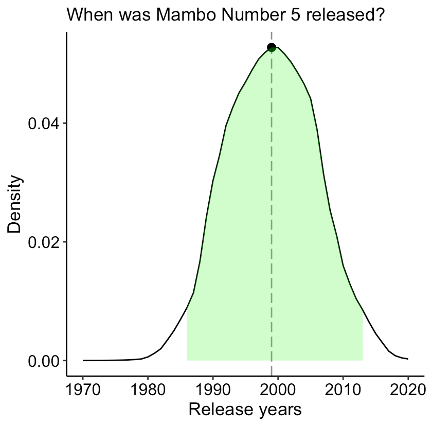 Based on the MAP, the release year that maximizes our posterior distribution is 1999, with the credible interval ranging from 1986 to 2008. I feel like that’s a pretty wide interval, but this is a silly project, so I’m not going to figure out how to make it better (I have other stuff to do!) I also found that it is a bit sensitive to the range of girl ages so if this was actual important research paper, this would be of course something I should really think about carefully.