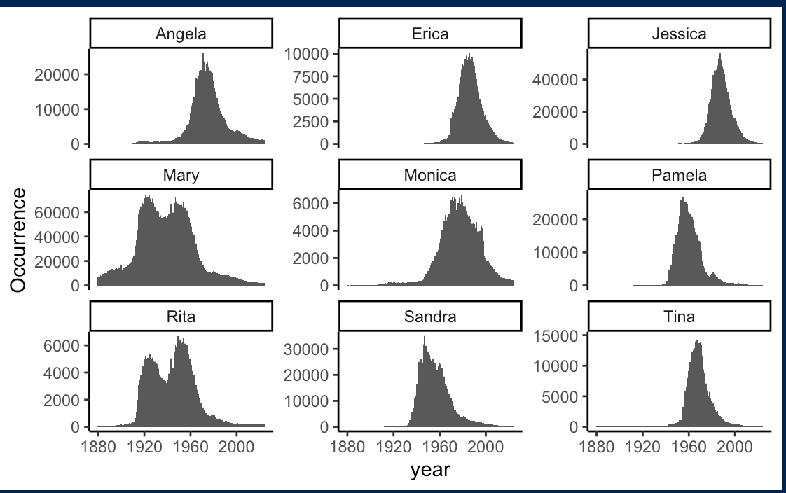 Subsetting the names to include only females, we can divide the total occurrence of a name by the total number of names given to baby girls to get the probabilities we need. So, I created a function to wrangle all of the text files into one dataframe. However, I should have realized that there’s an R package with the data already combined (Boo!).